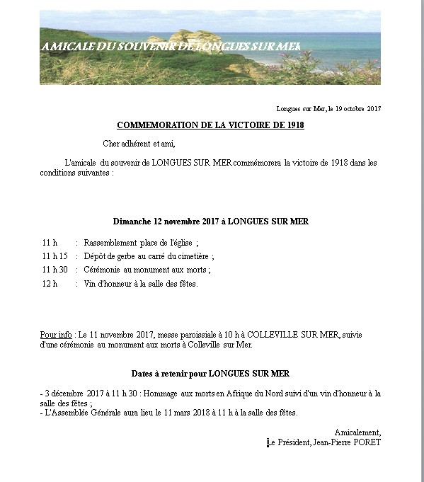 L'AMICALE DU SOUVENIR commémorera la Victoire de 1918 le dimanche 12 novembre 2017 à Longues sur Mer.