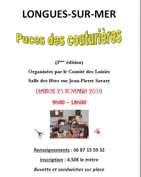 Les Puces des Couturières auront lieu le dimanche 25 novembre à la salle des fêtes de 9h00 à 18h00 – buvette et sandwichs sur place.