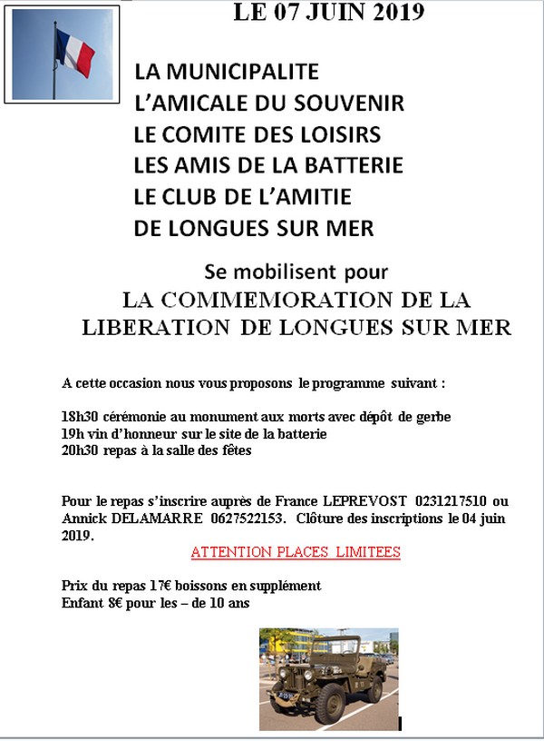 La Municipalité, l’Amicale du Souvenir, le Comité des Loisirs, les Amis de la Batterie et le Club de l’Amitié de Longues sur Mer se mobilisent pour la commémoration de la libération de Longues sur Mer.