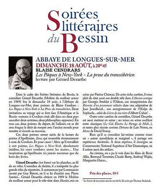 Dans le cadre des Soirées littéraires du Bessin, le comédien Gérard Desarthe lira deux poèmes de Blaise Cendrars : les Pâques à New-York et La prose du transsibérien.