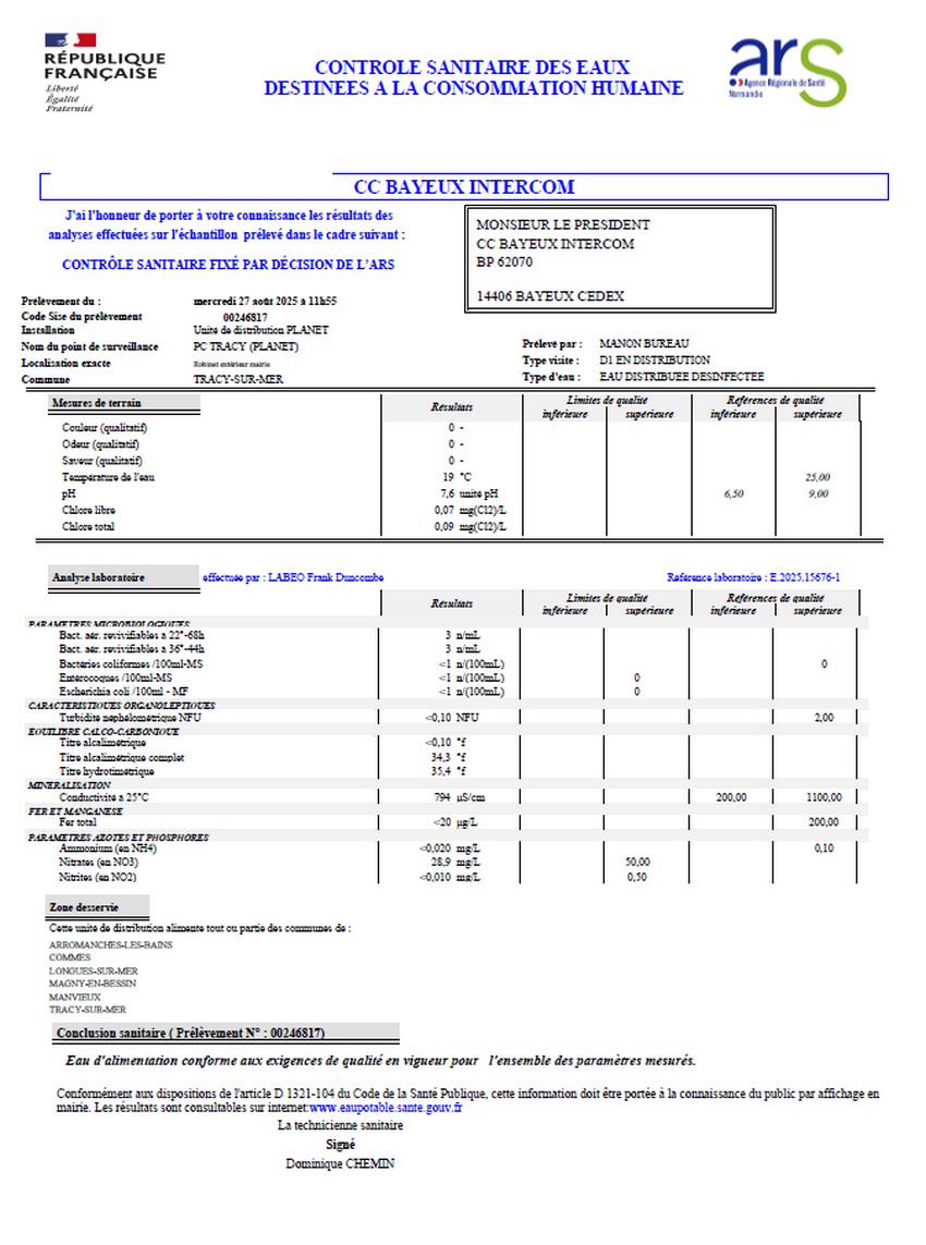 • Vous trouverez ci-après le résultat du contrôle sanitaire du 27.08.2025 PC Tracy (Planet).