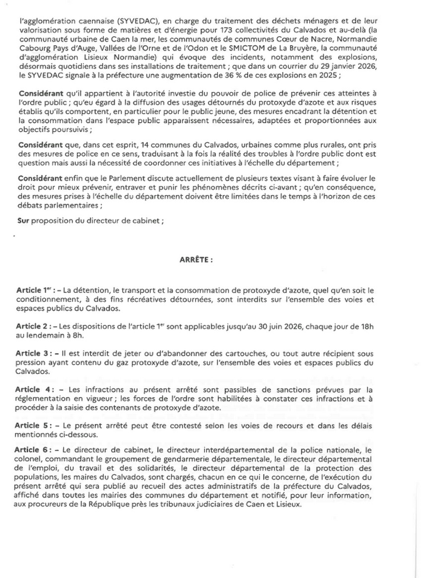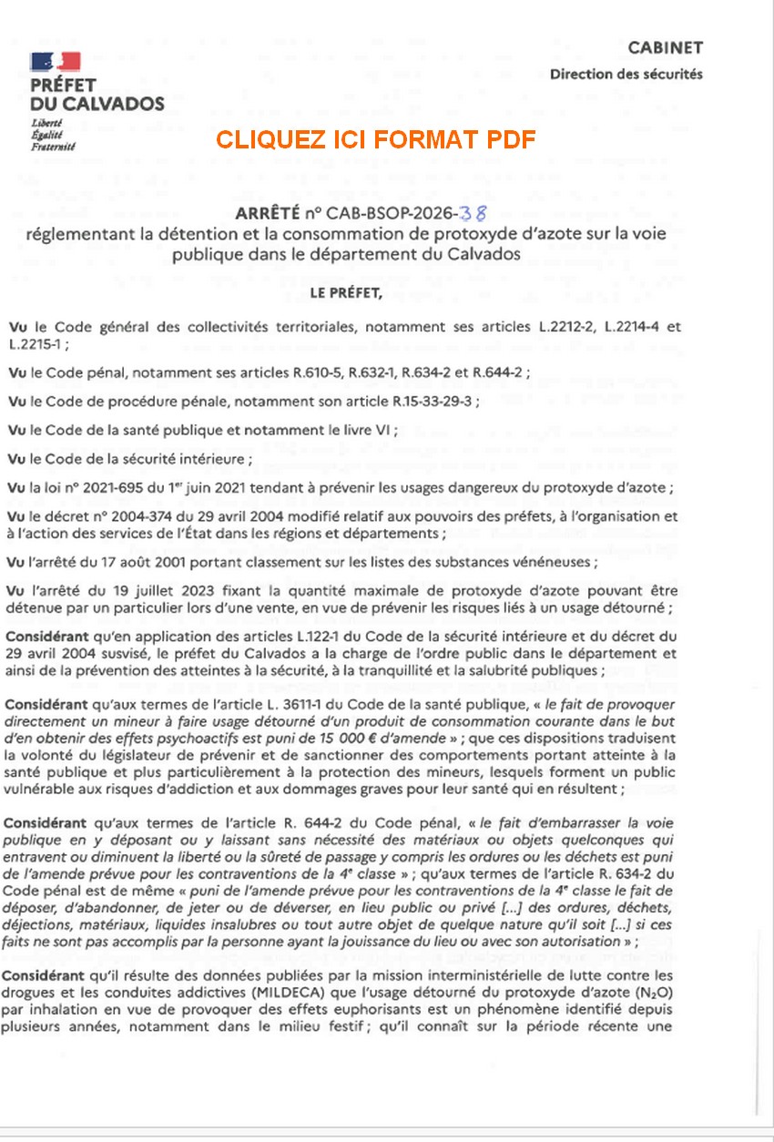 Ci-après, vous trouverez l’arrêté préfectoral pris par le préfet face à l’usage détourné et à l’augmentation préoccupante de la consommation de protoxyde d’azote, applicable à l’ensemble du département du Calvados.