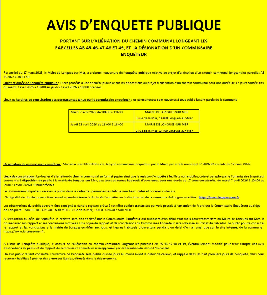 Nous vous prions de trouver ci-après l’affiche d’avis d’enquête publique « PORTANT SUR L’ALIÉNATION DU CHEMIN COMMUNAL LONGEANT LES PARCELLES AB 45-46-47-48 ET 49, ET LA DÉSIGNATION D’UN COMMISSAIRE ENQUÊTEUR « .