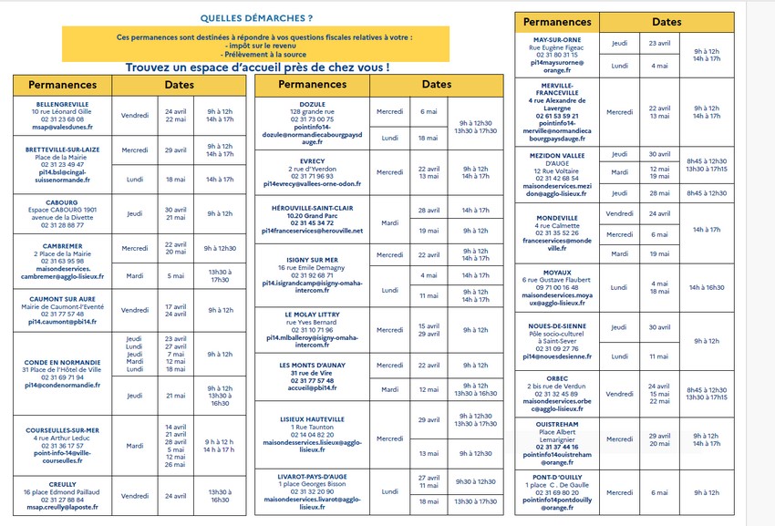 Dans le cadre de la campagne déclarative des revenus débutant ce jeudi 9 avril, ci-joint un flyer récapitulant les lieux, dates et horaires des permanences assurées par les agents des Finances publiques dans les Espaces France Services/Points Info 14.