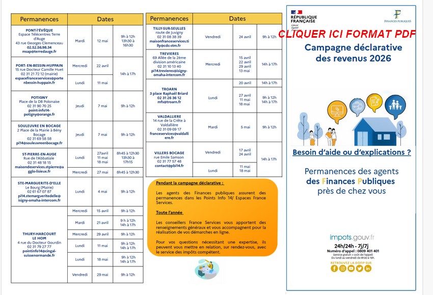Dans le cadre de la campagne déclarative des revenus débutant ce jeudi 9 avril, ci-joint un flyer récapitulant les lieux, dates et horaires des permanences assurées par les agents des Finances publiques dans les Espaces France Services/Points Info 14.